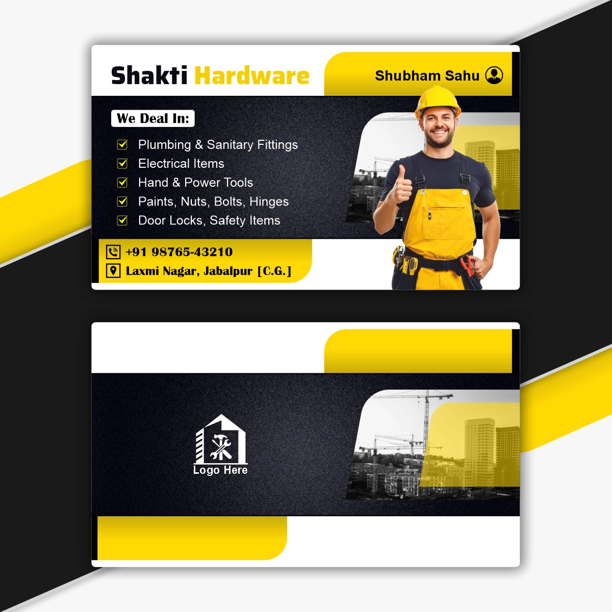 This professional hardware shop business card design template is created for hardware stores, tool shops, and construction material businesses.